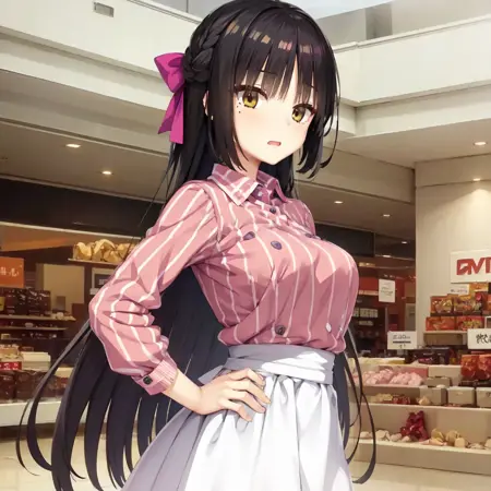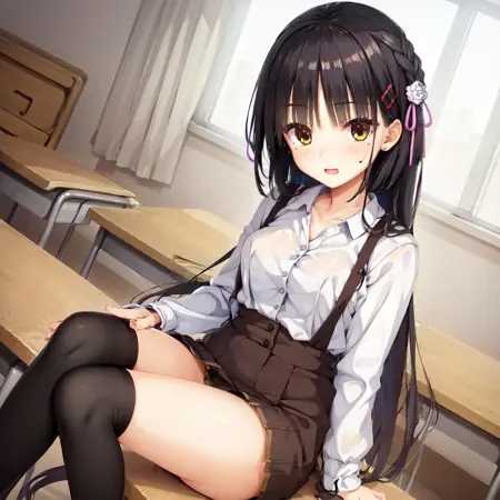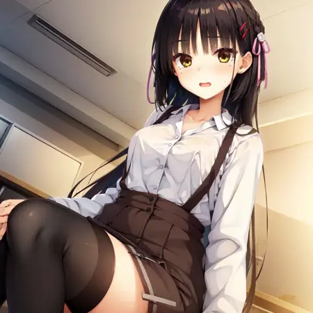 スカートのプロンプトから「suspender」を削除し、「high-waist skirt」だけにすれば、サスペンダーが生成されない状態で生成されます。