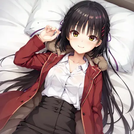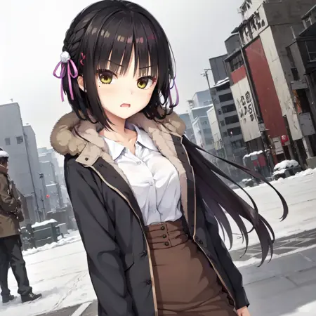 • ジャケット:Natsume、1girl、solo、long hair、blush、smile、skirt、simple background、shirt、black hair、thighhighs、long sleeves、ribbon、yellow eyes、closed mouth、standing、full body、hair ribbon、side braid、flower、shoes、hairclip、hand up、hair flower、high heels、zettai ryouiki、coat、fur trim、dress shirt、white background、straight hair、pink ribbon、high-waist skirt、open coat、fur-trimmed coat、brown coat、pumps、striped、hood、looking to the side、buttons、hood down、wing collar、arm at side、shirt tucked in、hooded coat、hand on own chin、over-kneehighs、mole under eye、open clothes、red hairclip、tachi-e