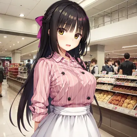 • ウェイトレス/ショートエプロン:Natsume、1girl、solo、long hair、breasts、viewerを見つめている、blush、smile、skirt、simple background、shirt、black hair、sleeves past elbows、bow、yellow eyes、medium breasts、closed mouth、standing、full body、hair bow、frills、shoes、striped、sailor collar、high heels、head tilt、bare legs、buttons、arms behind back、frilled skirt、white background、waist apron、half updo、pocket、frilled apron、waitress、pumps、sidelocks、collared shirt、wing collar、straight hair、purple bow、striped shirt、plaid、mole under eye、vertical-striped shirt、tachi-e、clothes writing、english text、hand on own arm、holding own arm、print apron