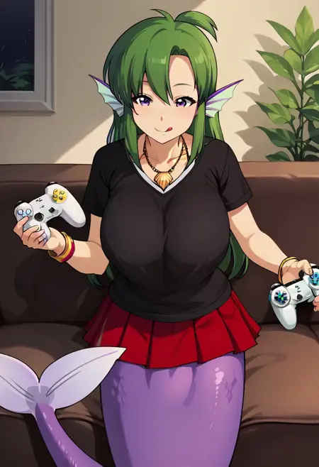 Main appearance tags: mermaid, mermaid tail, head fins, green hair, purple eyes, purple tail, ahoge, side bangs, hair over breasts, large breasts