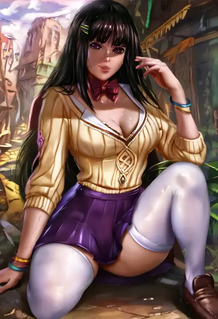 | トレーニングワード | Miyu BC, 1girl, solo, long hair, bangs, black hair, hair ornament, thighhighs, long sleeves, bow, cleavage, jewelry, purple eyes, jacket, shoes, hairclip, hood, bowtie,red bow, bracelet, white thighhighs, hoodie, brown footwear, loafers, hooded jacket, purple skirt, animal hood, striped sweater, hairclipコピーしました! |