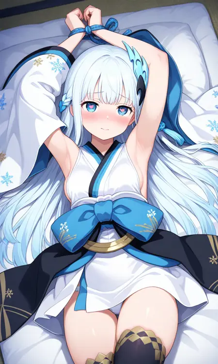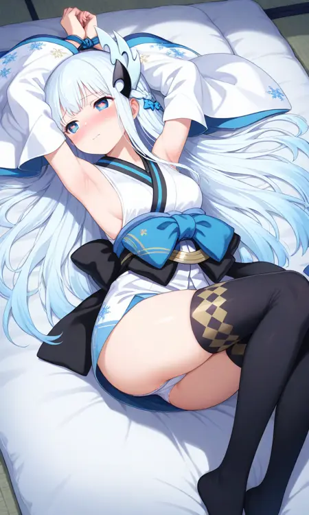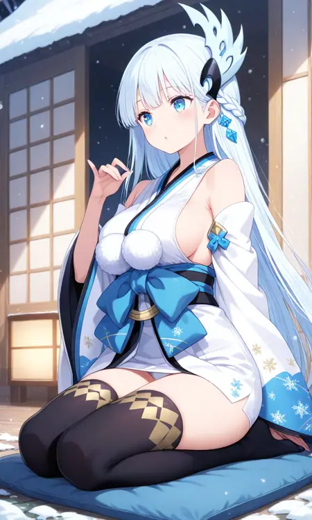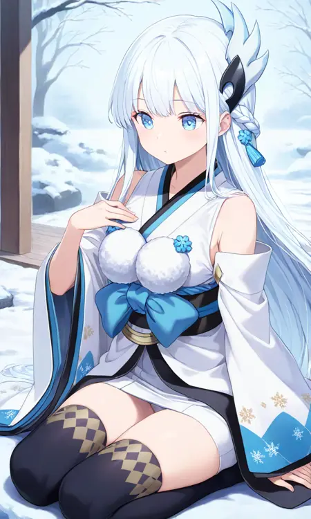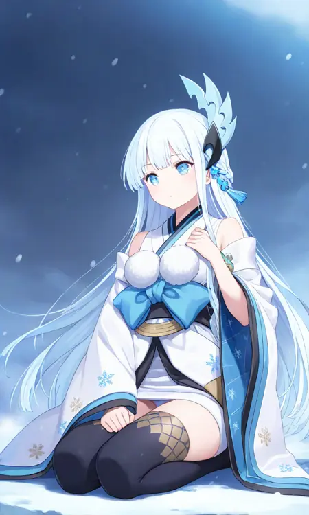 Yuki Onna, japanese clothes, japanese attire, white attire, bare shoulder, detached sleeve, wide sleeve, white hair, extremely long hair, blue eyes, hair ornament, black thigh highs, white kimono, white sleeve, blue obi, black sash
