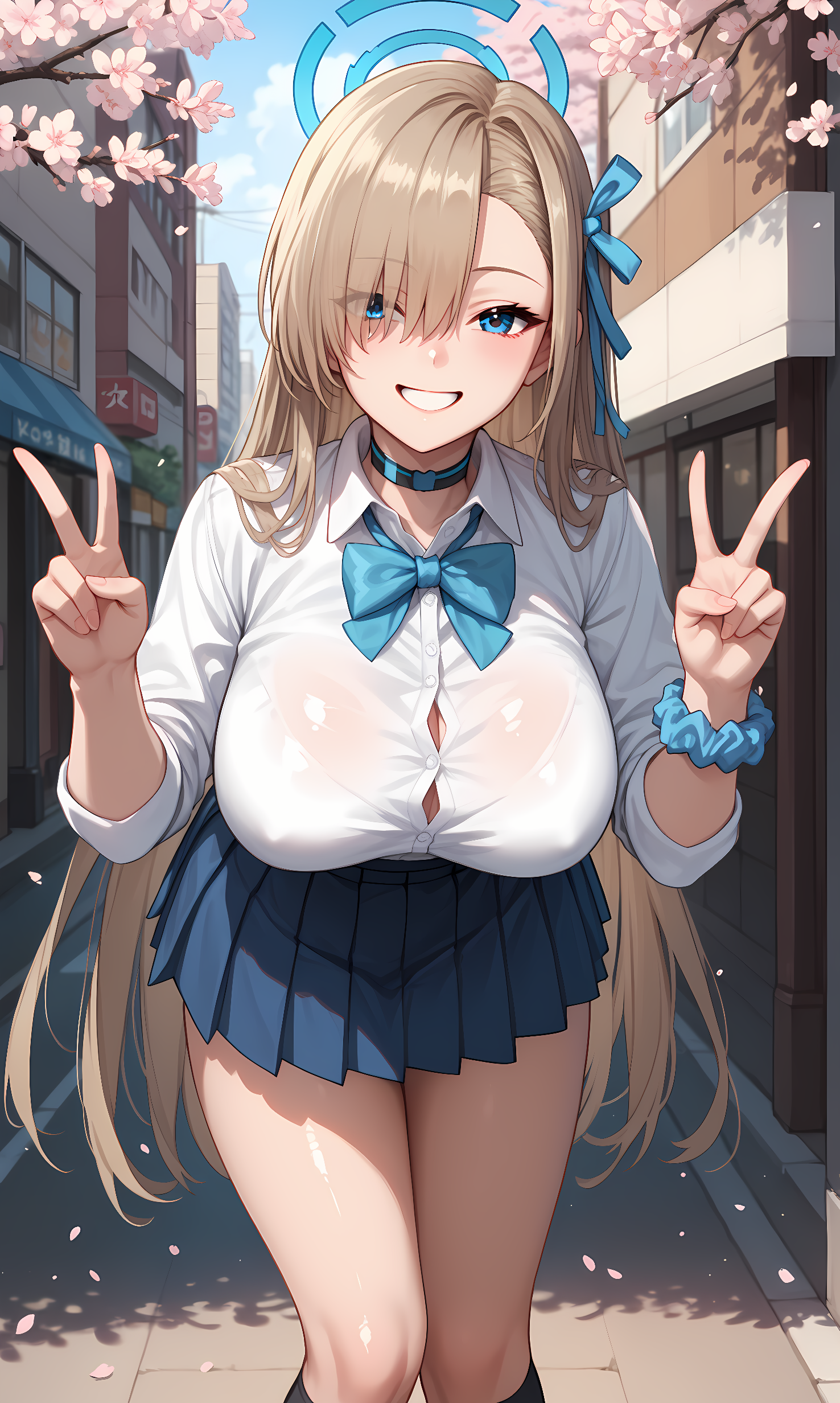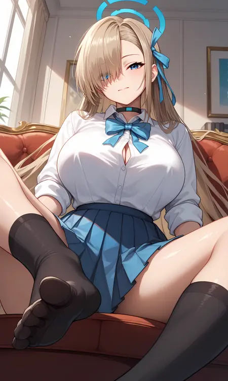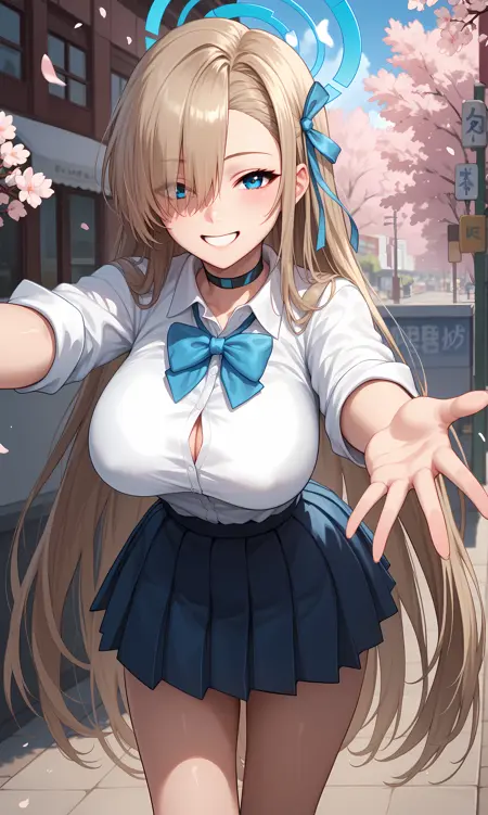 校服女孩:ichinose_asuna,蓝眼睛,金发,长发,头发遮住一只眼睛,蓝色丝带,发带,光环,有领衬衫,袖子卷起,蓝色蝴蝶结,项圈,单腕束带,腰裙,蓝色裙子,百褶裙,迷你裙,黑色袜子,黑色鞋子
