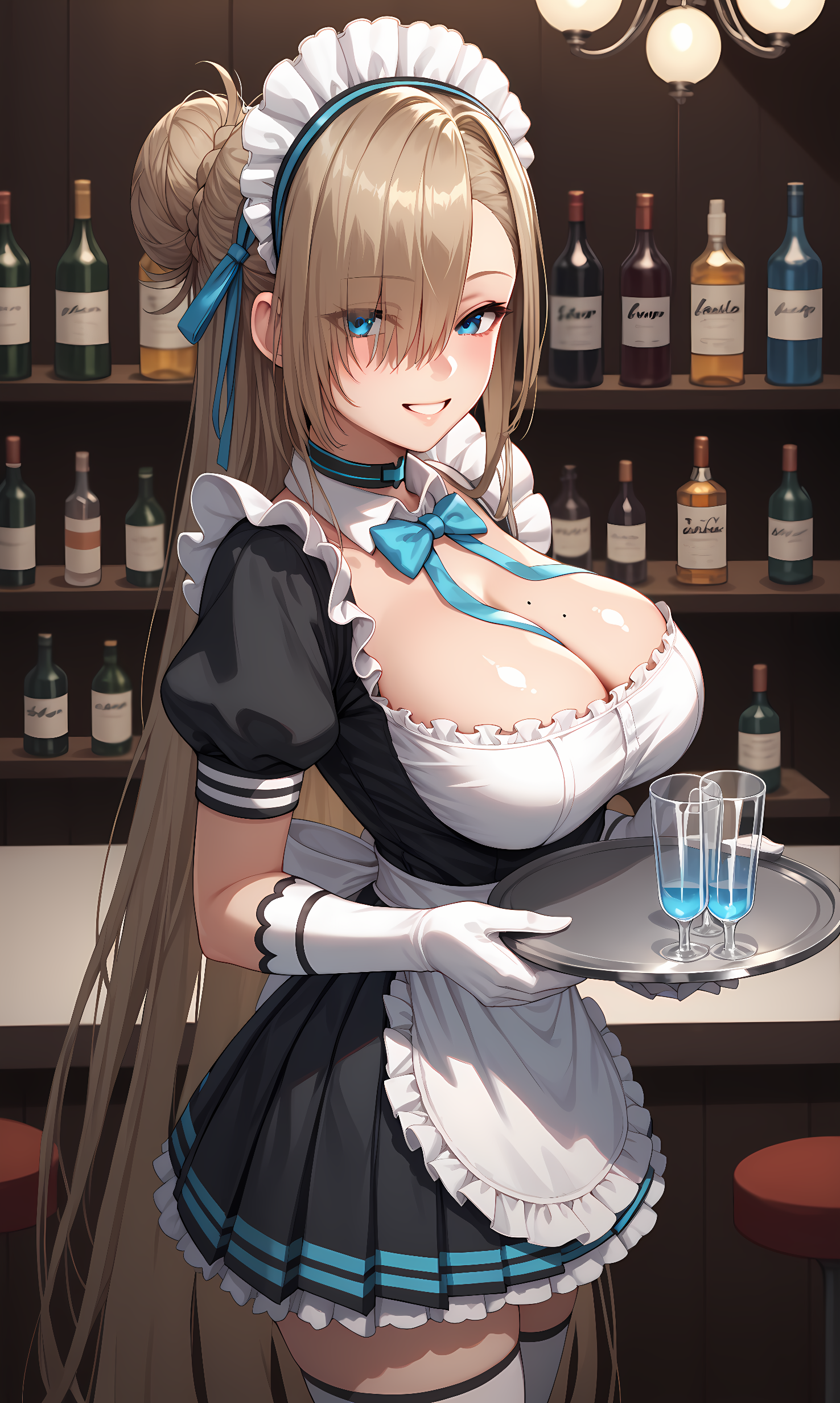 服装:女仆头饰,项圈,可拆卸衣领,蓝色蝴蝶结,黑色连衣裙,蓬松袖子,短袖,露胸,围裙,荷叶边裙,百褶裙,白色过膝袜,白色手套,肘部手套,痣,胸前有痣,黑色鞋履