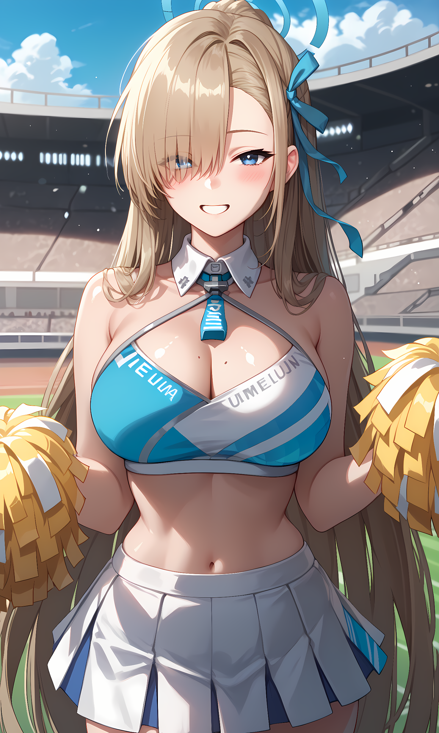 外观:ichinose_asuna,蓝眼睛,金发,长发,头发遮住一只眼睛,单发髻,光环