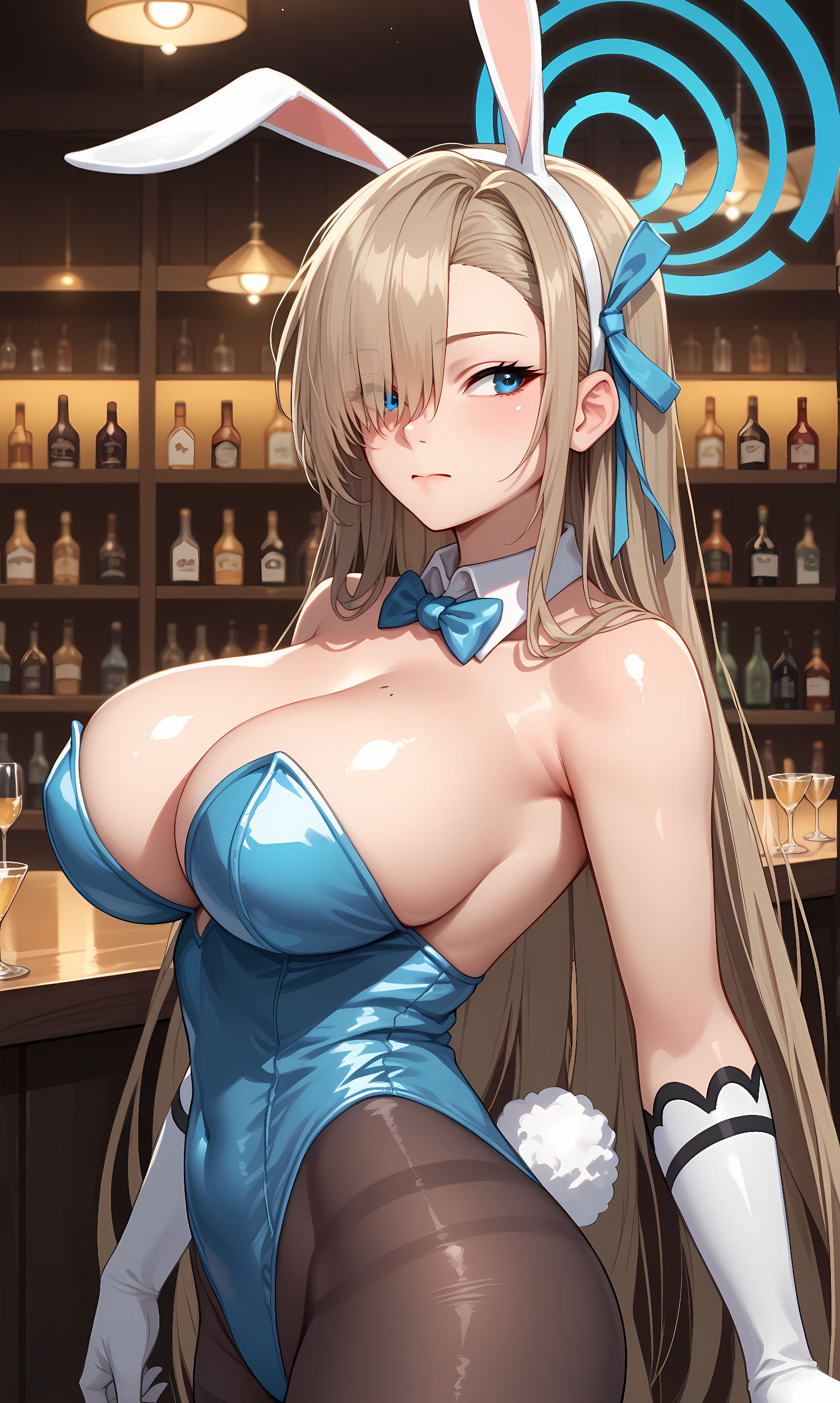 兔子女孩版:ichinose_asuna,蓝眼睛,金发,长发,头发遮住一只眼睛,蓝色丝带,发带,光环,花花公子兔女郎,蓝色紧身衣,假动物耳朵,兔耳,白色手套,肘部手套,可拆卸衣领,蓝色蝴蝶结,黑色连裤袜,白色鞋履,细高跟鞋