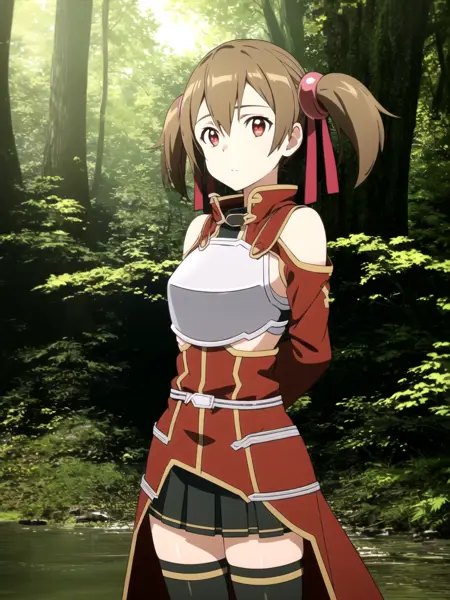 SAO 의상: silicabase, 갈색 머리카락, 짧은 이중꼬리, 붉은 눈, 갑옷, 주름 치마, 허벅지까지 오는 양말, 어깨 노출, 가슴 보호대, 머리 리본