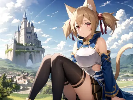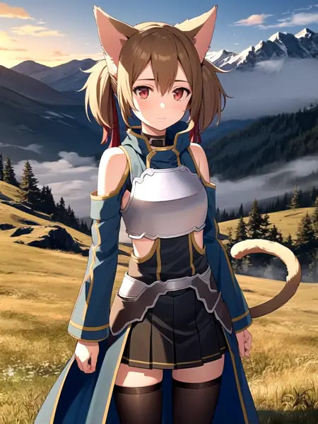 ALO 의상: silicaalo, 갈색 머리카락, 짧은 이중꼬리, 붉은 눈, 고양이 귀, 고양이 꼬리, 갑옷, 주름 치마, 허벅지까지 오는 양말, 어깨 노출, 가슴 보호대, 머리 리본