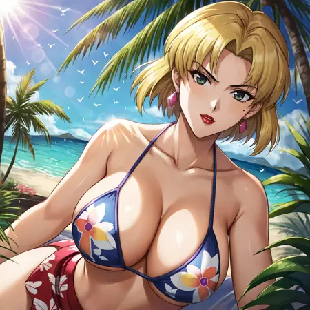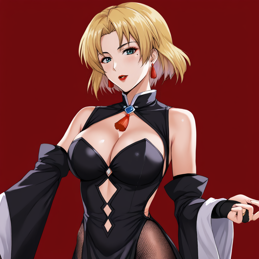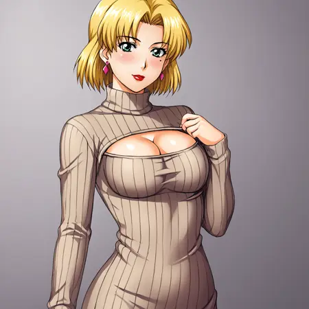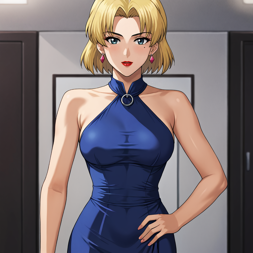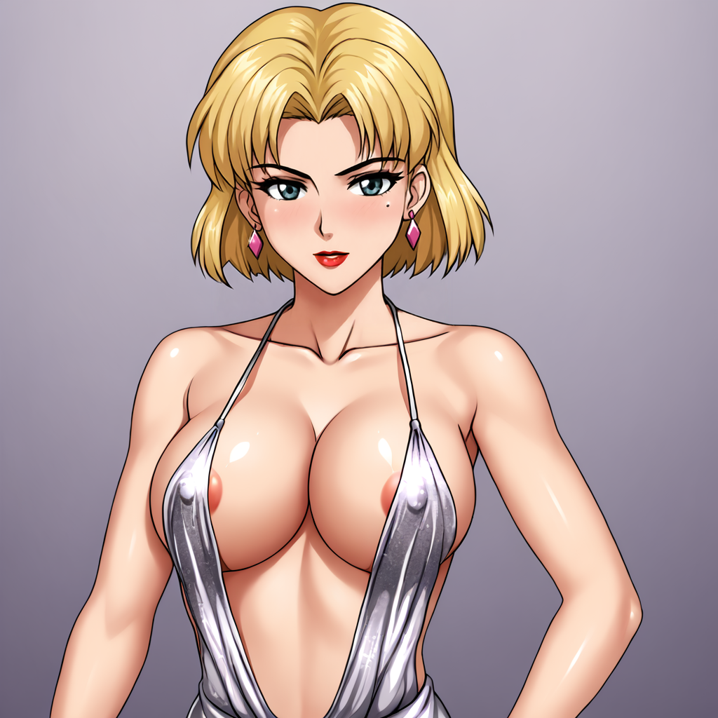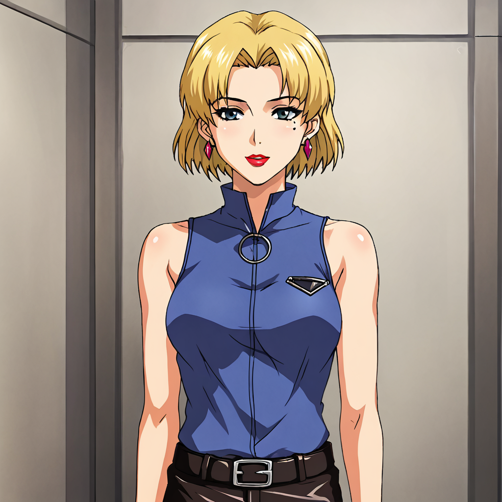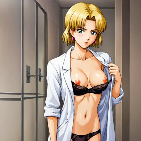 トリガー:Ritsuko, 1girl, ブロンドヘア, 目の下のほくろ, ラボコート, ピアス, ジュエリー, 短髪, ベルト, リップスティック, メイク