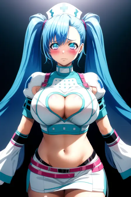 기본 복장 - 화이트 크롭탑, 화이트 미니스커트, 화이트 팔 덮개, 화이트 허벅지 부츠, 간호사모자