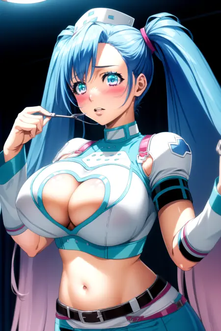 メイン衣装 - ホワイトカットソー、ホワイトミニスカート、ホワイトアームウォーマー、ホワイトスネークブーツ、ナースキャップ