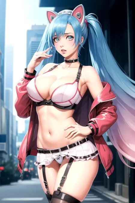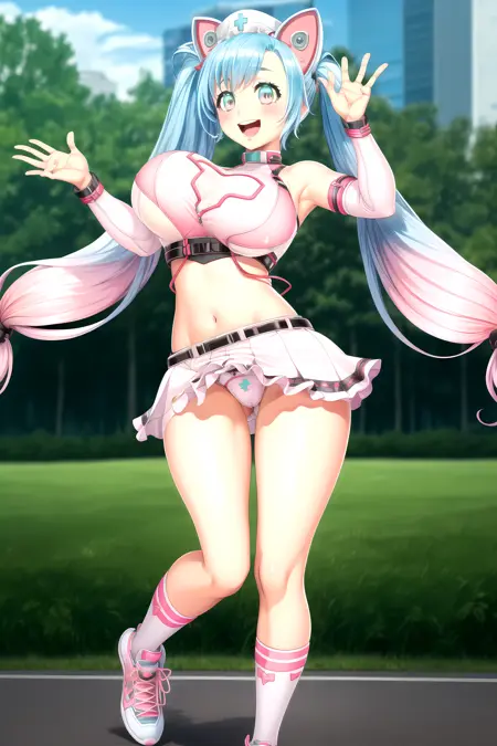 チアリーダー衣装(モバイルゲームより)- ピンクカットソー、ピンクスカート、ピンクエルボースリーブ、裸の肩、猫耳、ナースヘッドギア、スニーカー