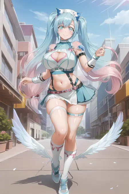 Main Outfit - white crop top, white miniskirt, white arm warmers, white thigh boots, nurse cap