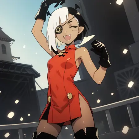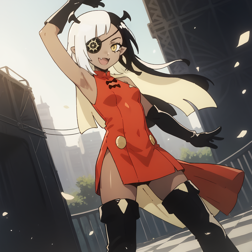 트리거 단어 및 외모: lugosichan, 검은 피부, 다채로운 머리카락, 흑백 머리카락, 안대, 노란 눈, 피부 이빨