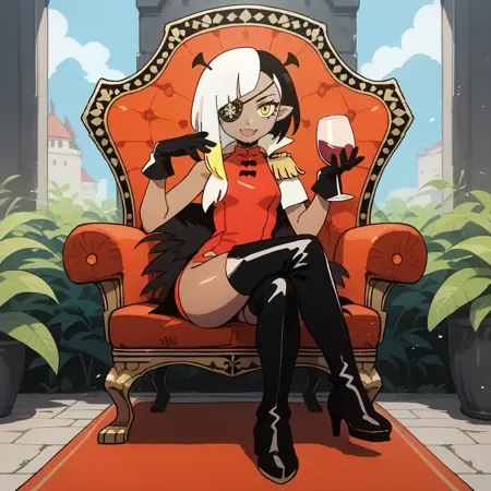 기본 복장: 흰색 어깨 패드, 빨간 드레스, 검은 팔꿈치 장갑, 검은 허벅지 부츠