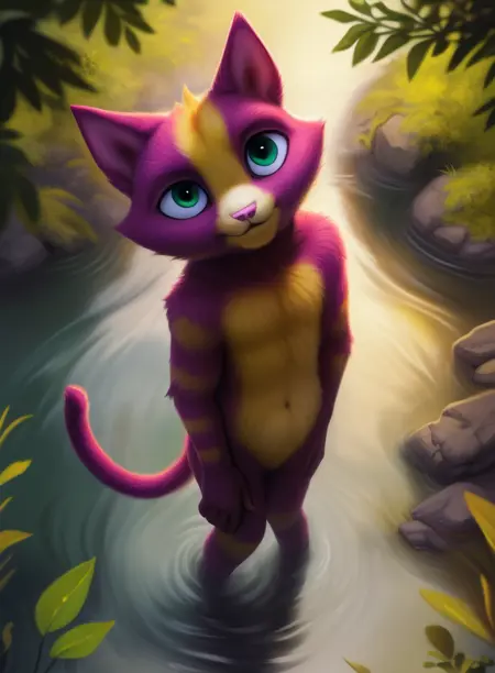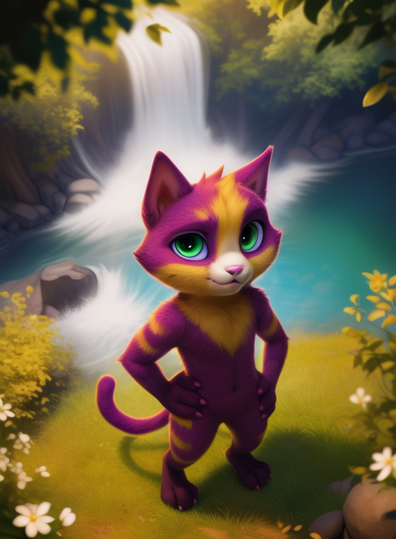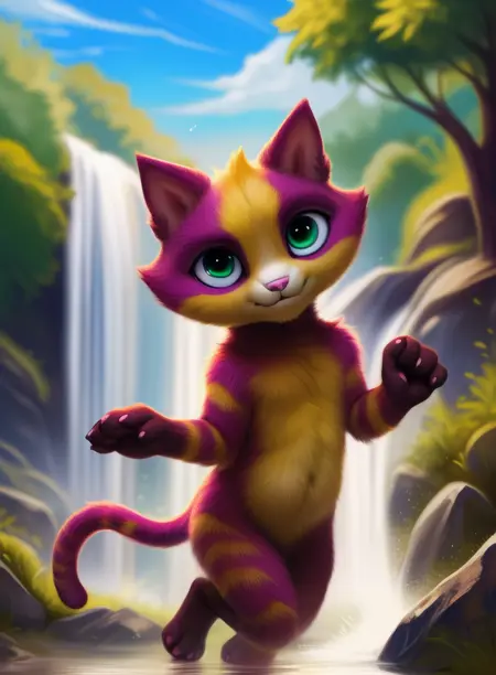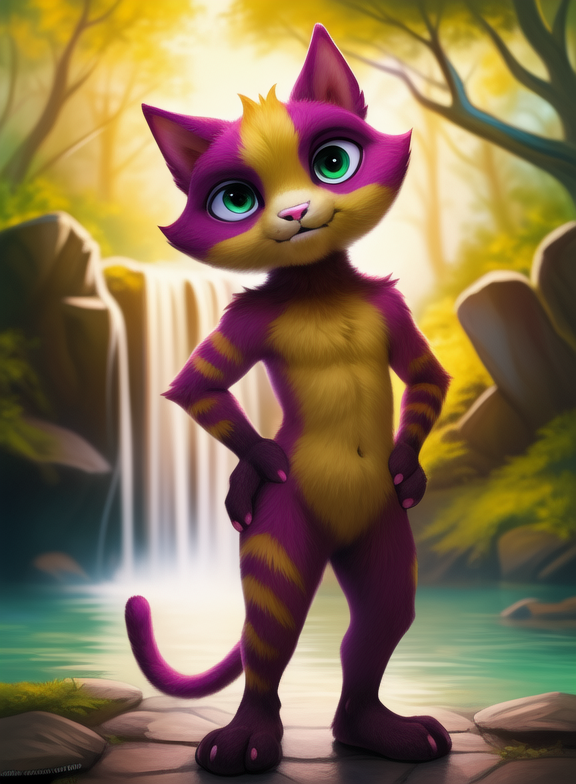 LinoCatUmaAve, cat, pink nails, , purple fur with yellow, tail, pink nose, light green eyes,
