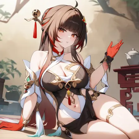 Others: 1girl,lingsha_(honkai_star_rail),breasts,solo,smile,large_breasts,bare_shoulders,cleavage,navel,