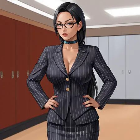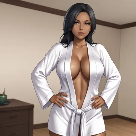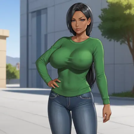 - 트리거: Jademk9, 1girl, 큰 가슴, 긴 머리, 입 마스크, 검은 피부, 검은 피부 여자, 손가락 없는 장갑, 검은 머리, 가슴 사이 벌어짐, 중앙 열림, 배꼽, 어깨 노출, 체인, 팔찌, 허벅지