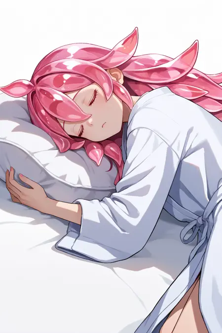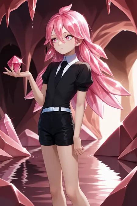 외모: morg, 하얀 피부, 긴 머리, 크리스털 머리, 분홍 머리, 분홍 눈, 눈 사이의 머리