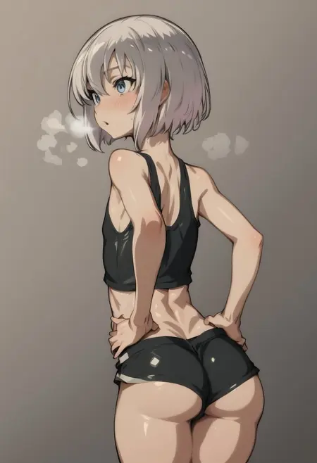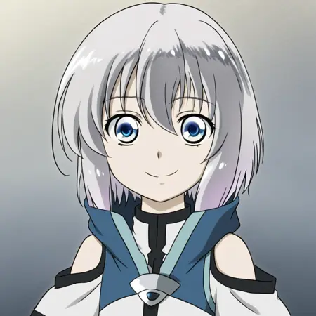 Prompt: ernesti echevalier,tomgirl,1boy,male focus,smile,shoulder cutout,blue eyes,clothing cutout,looking at viewer,solo,grey hair,short sleeves,bangs,otoko no ko,shirt,upper body,medium hair