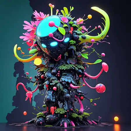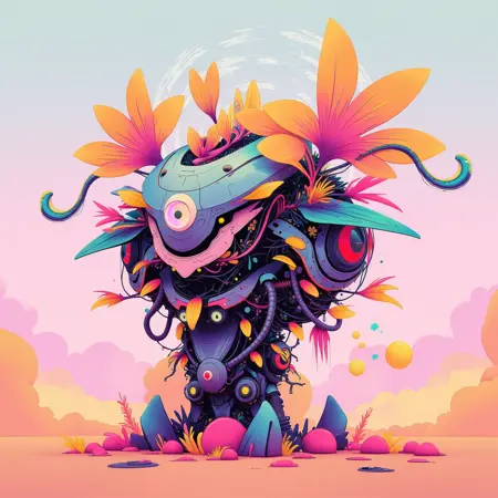 A vivid, surreal mecha creature with colorful flora and mushrooms with whimsical shapes emerges, blending nature, metallic like monster, 3D imagination in harmonious chaos.