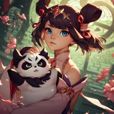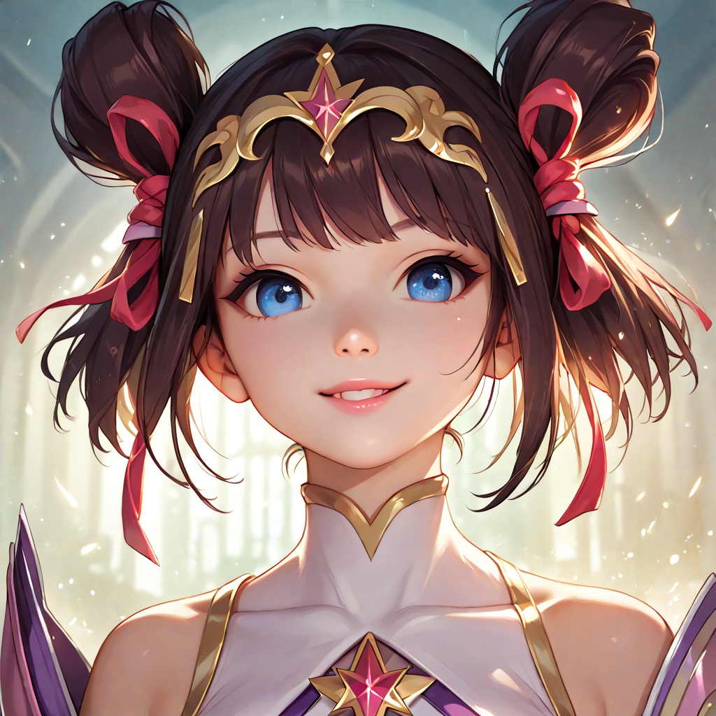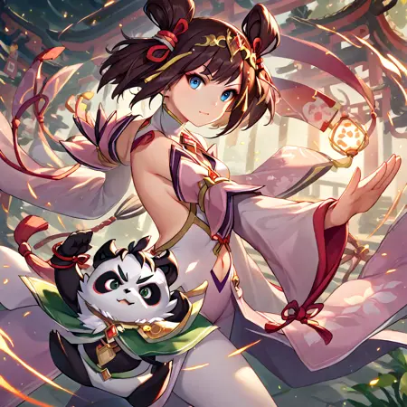 Trigger words: LinYou, brown hair, short hair, blue eyes, headgear, ribbon, buns, kung-fu clothes, detached sleeves, long sleeves