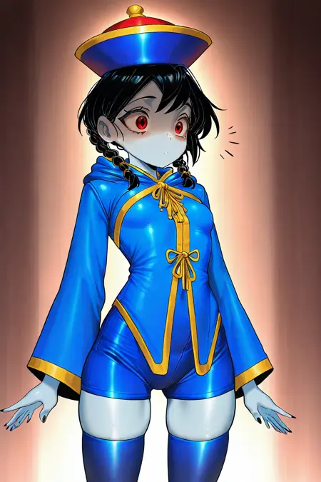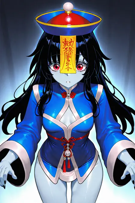 TAG:ofuda, jiangshi, skyzen, blue skin, chinese clothes, red eyes, 1girl, black hair