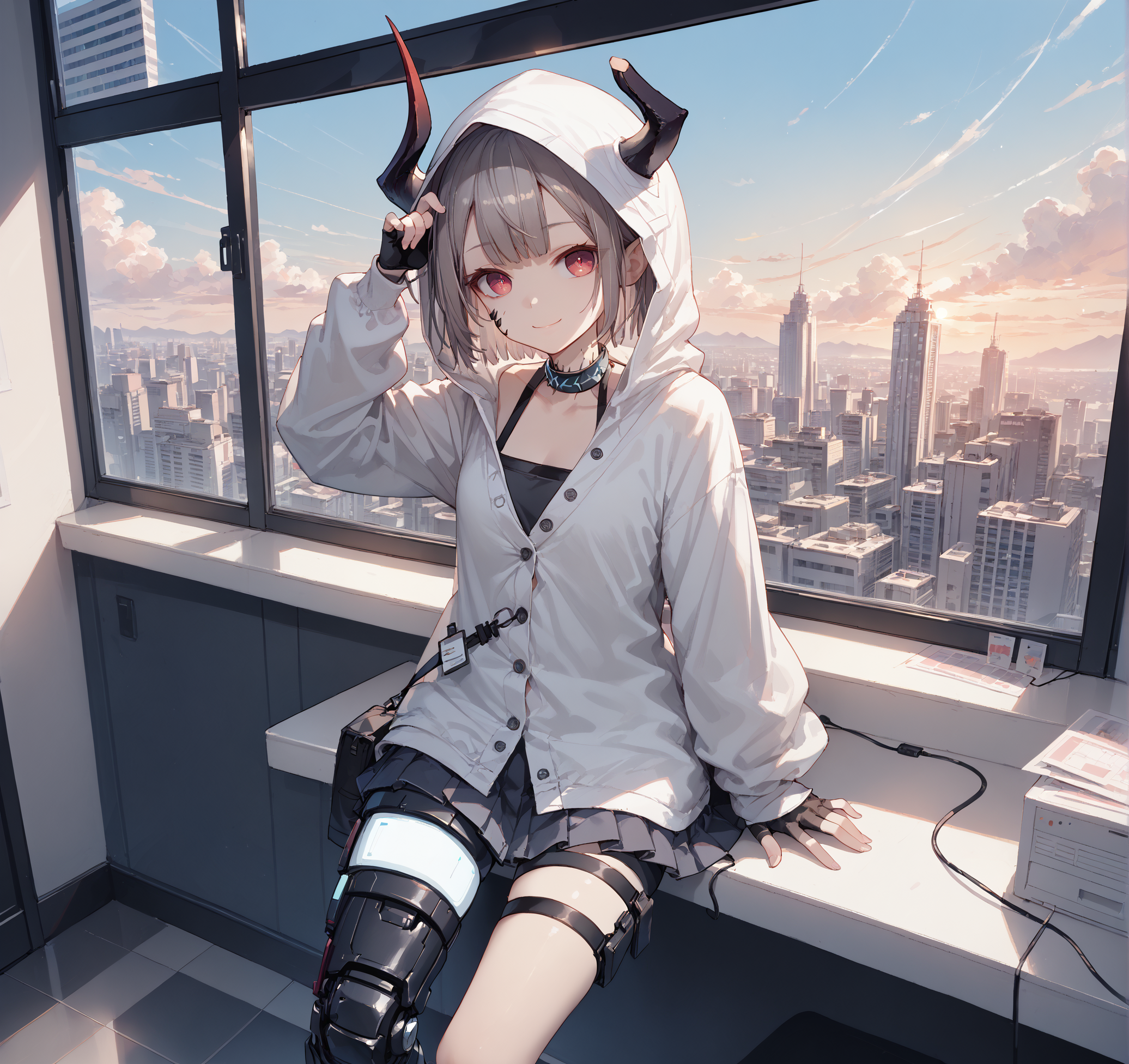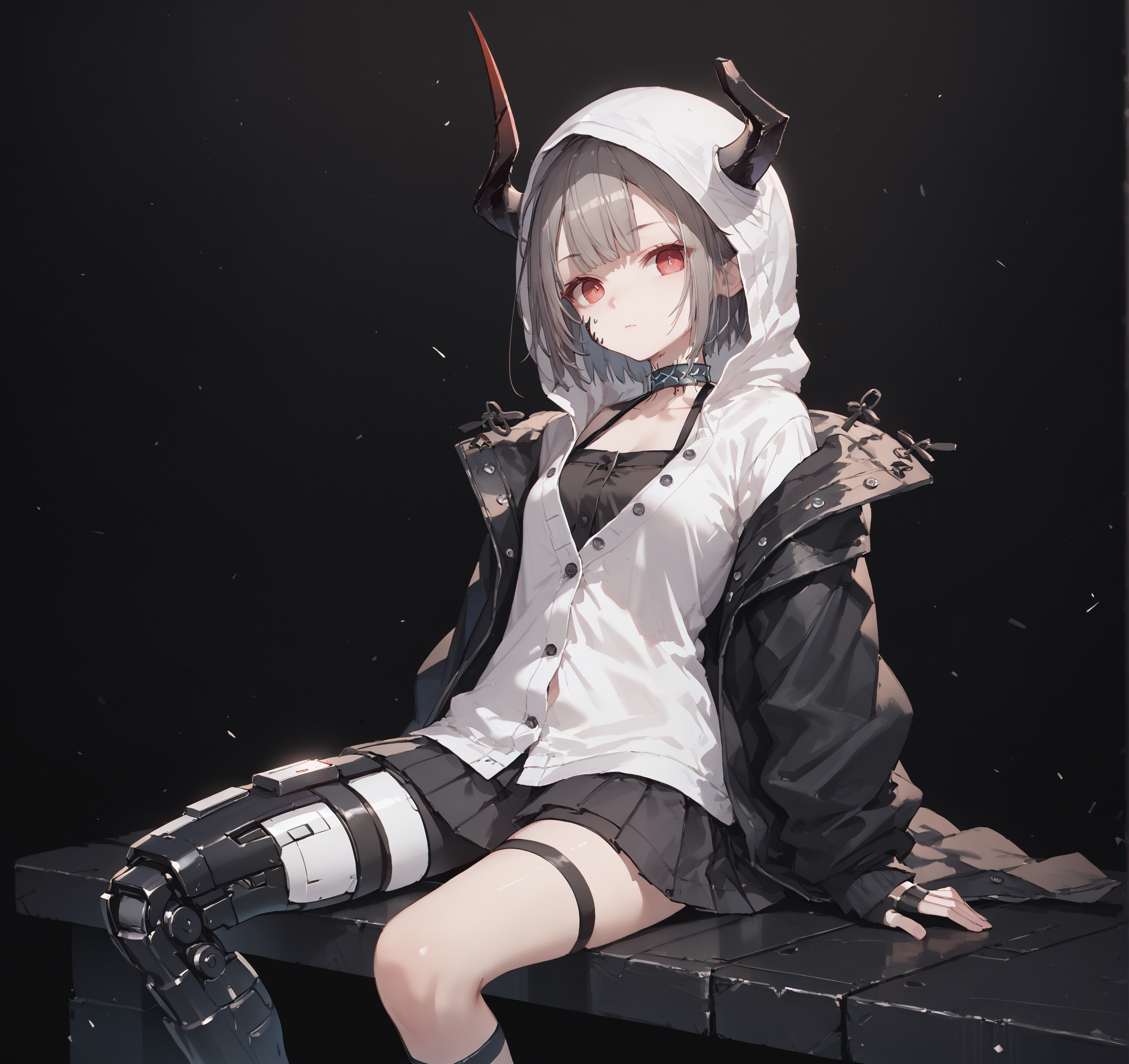 검정 재킷, 버튼 다운 후드티, 후드, 후드 위로, 머리장식을 통해 뿔, 검정 드레스, 치마, 오리파시 병변, 감염 모니터,