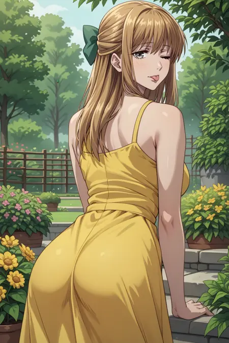 리츠의 주요 복장(초록 키모노)의 경우 다음을 사용하세요: NSRitsuFrusket, 회색 눈, 중간 길이 머리, 반쯤 올린 머리, 초록색 머리 리본, 연한 갈색 머리, 초록 키모노, 노란 오비, 긴 소매, 넓은 소매, 플로럴 프린트