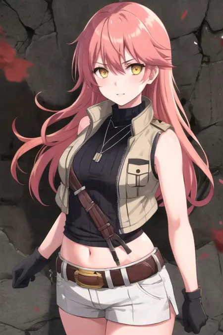 | 학습된 단어 | SaraJaeger, 1girl, solo, long hair, black thighhighs, black gloves, navel, brown eyes, jewelry, yellow eyes, pink hair, red hair, short shorts, sleeveless, midriff, belt, necklace, khaki vest, black turtleneck, single thighhigh, white shorts, 복사됨! |
