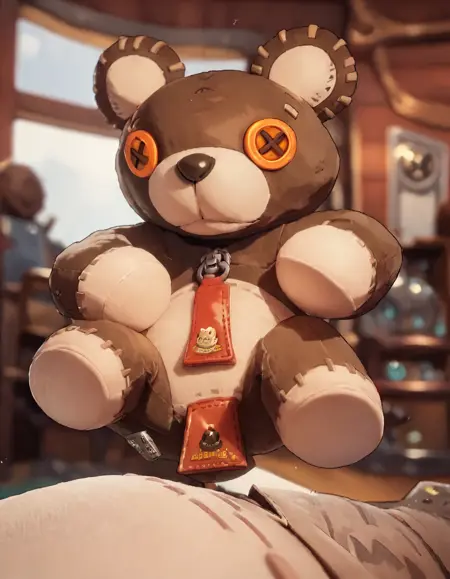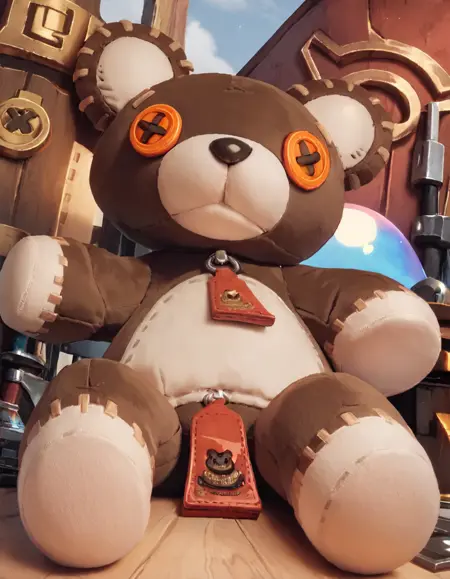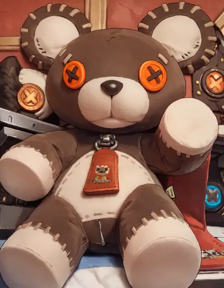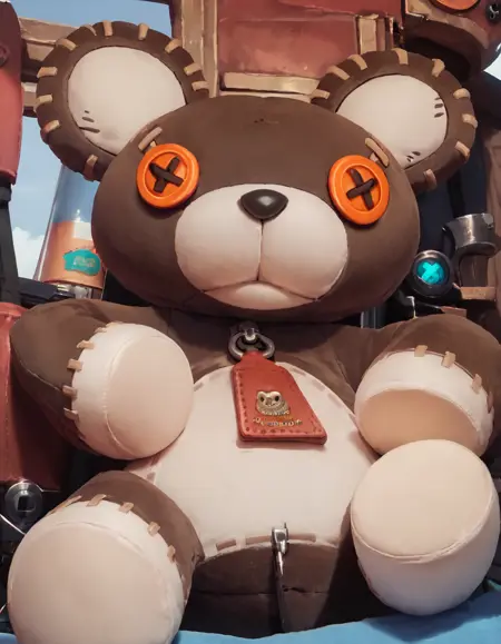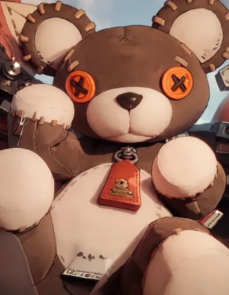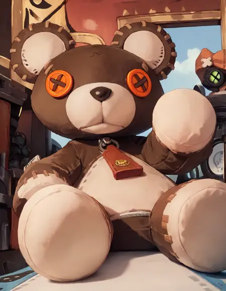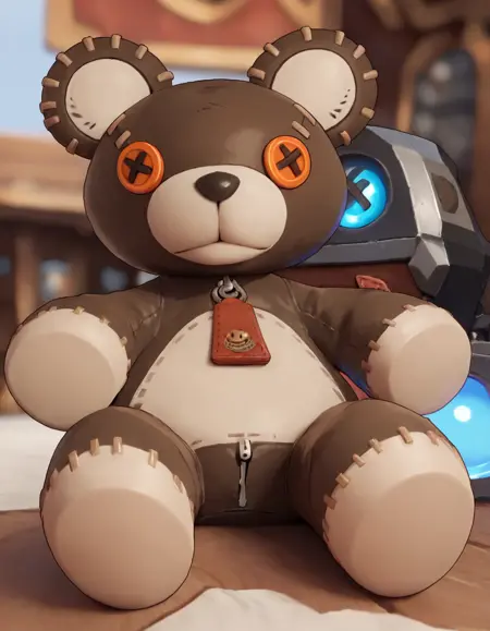 r0gerggs, stuffed toy, teddy bear, looking at viewer, zipper pull tab, stitches, roger (guilty gear)