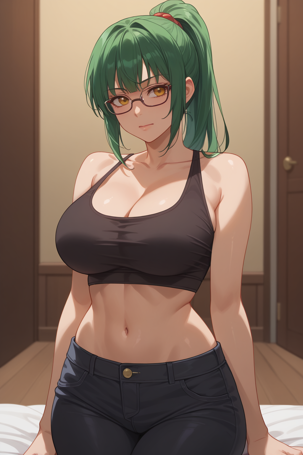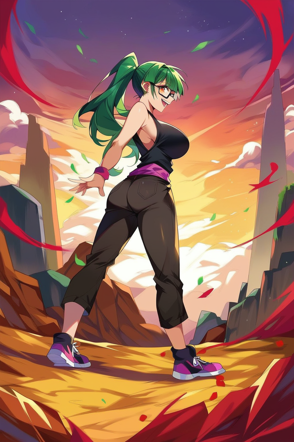 S1 Maki プロンプト: Maki、Zen'in Maki、琥珀色の瞳、大きな胸、ポニーテール、緑の髪、眼鏡、