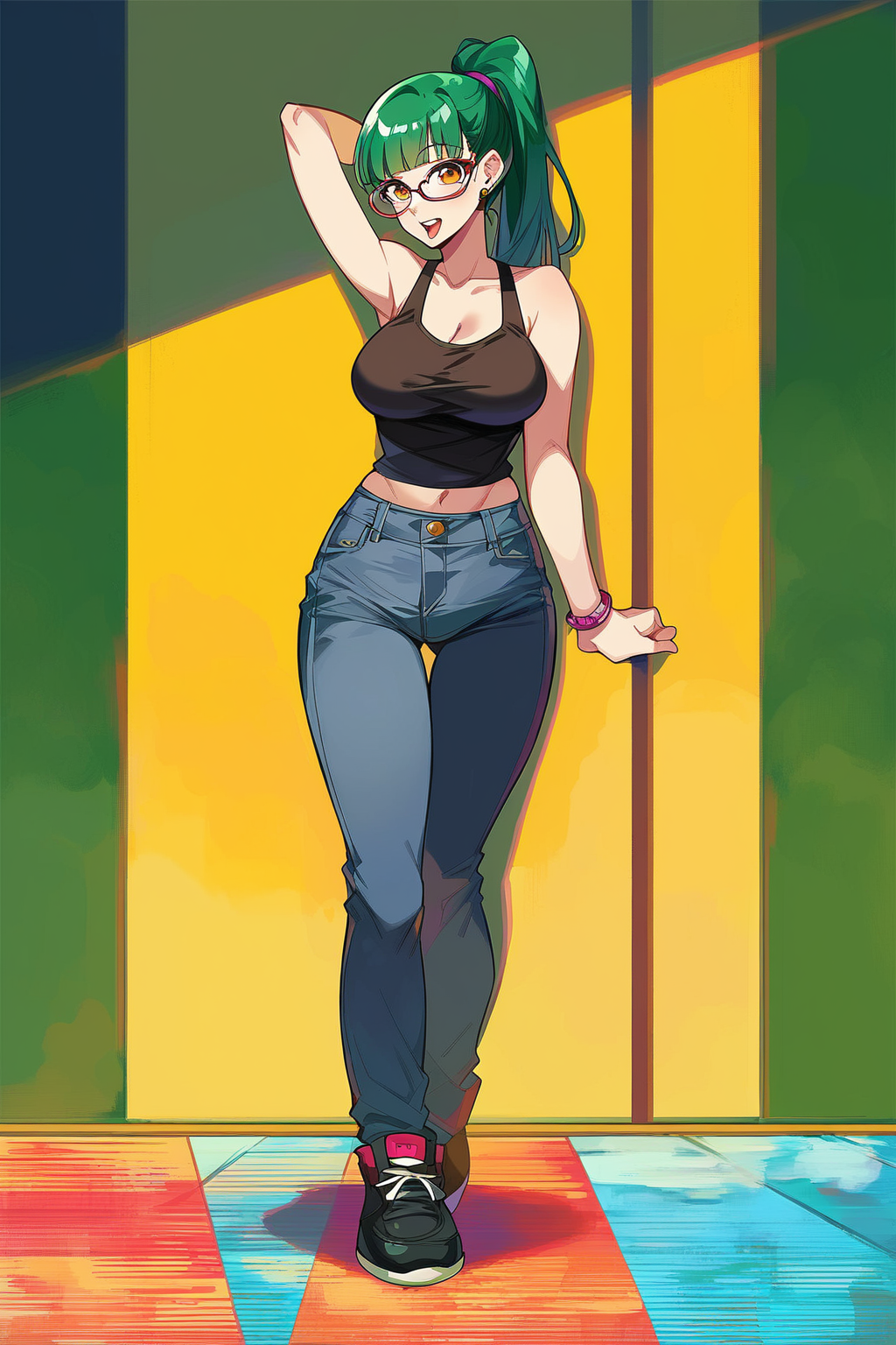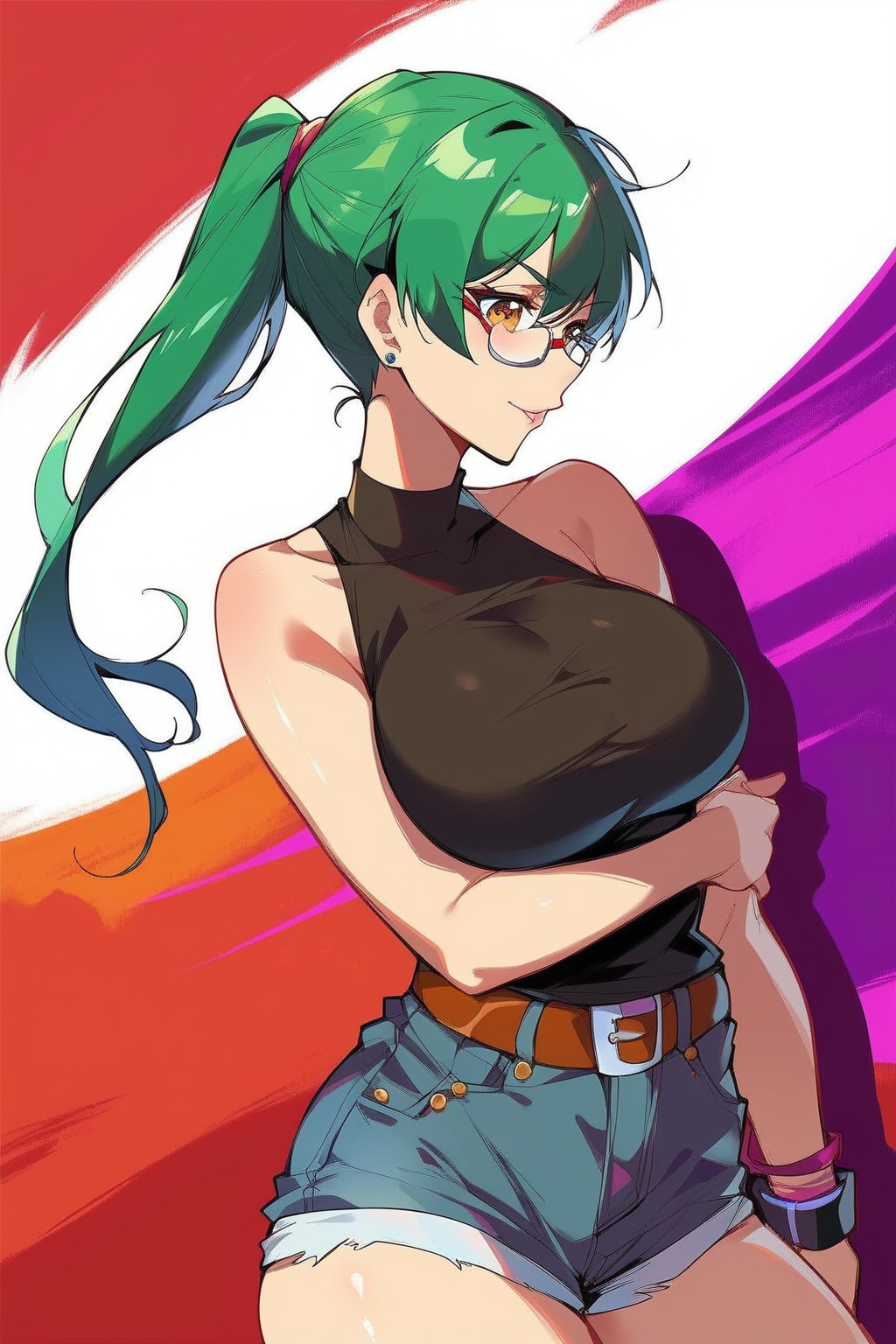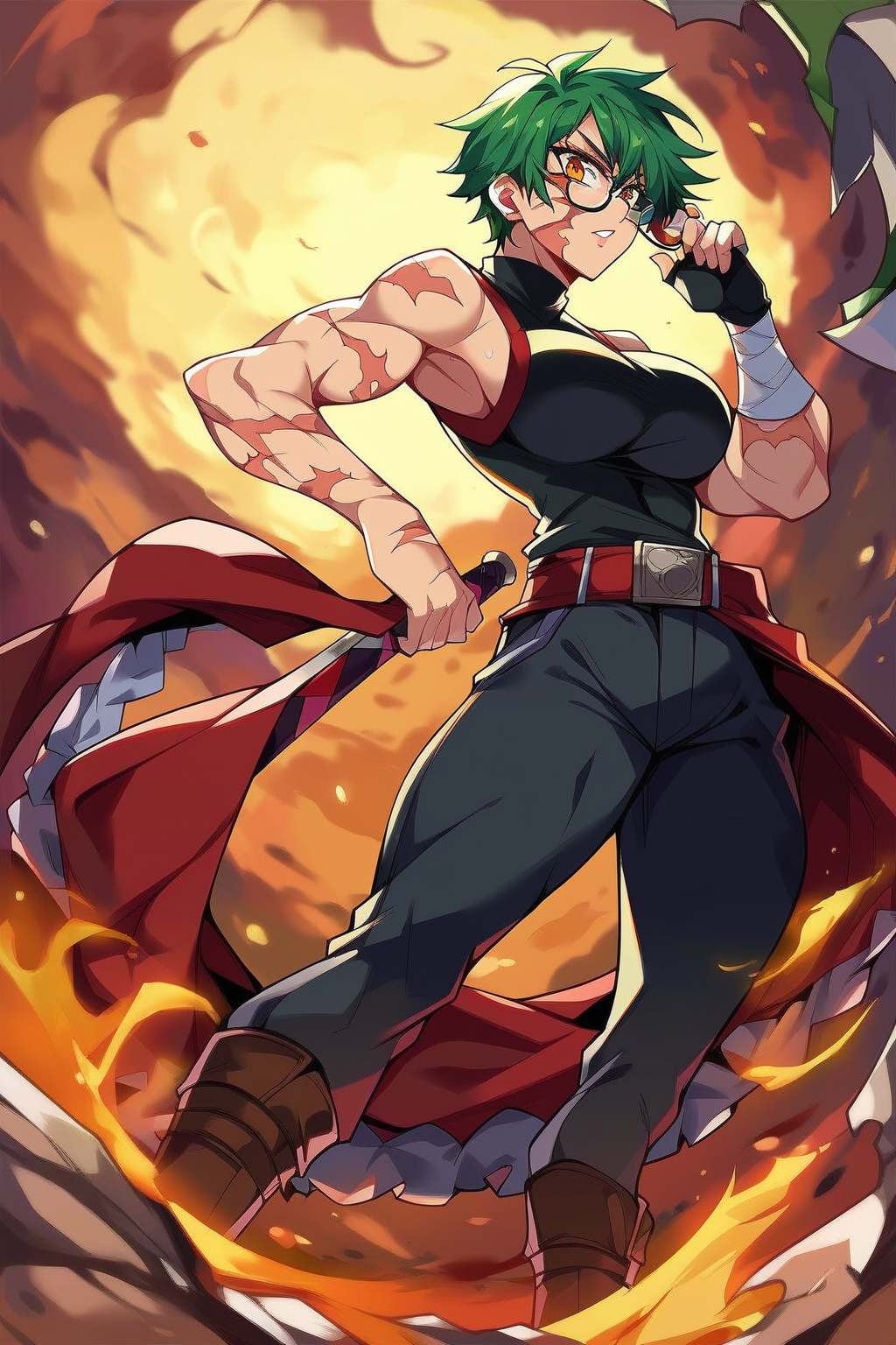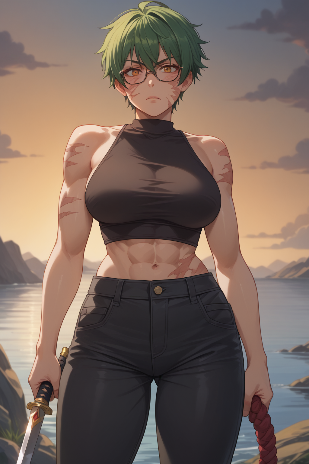 プロンプト: Maki、Zen'in Maki、琥珀色の瞳、大きな胸、筋肉質、緑の髪、眼鏡、短髪、顔の傷、体の傷、黒いシャツ、ノースリーブ、黒いズボン、剣、