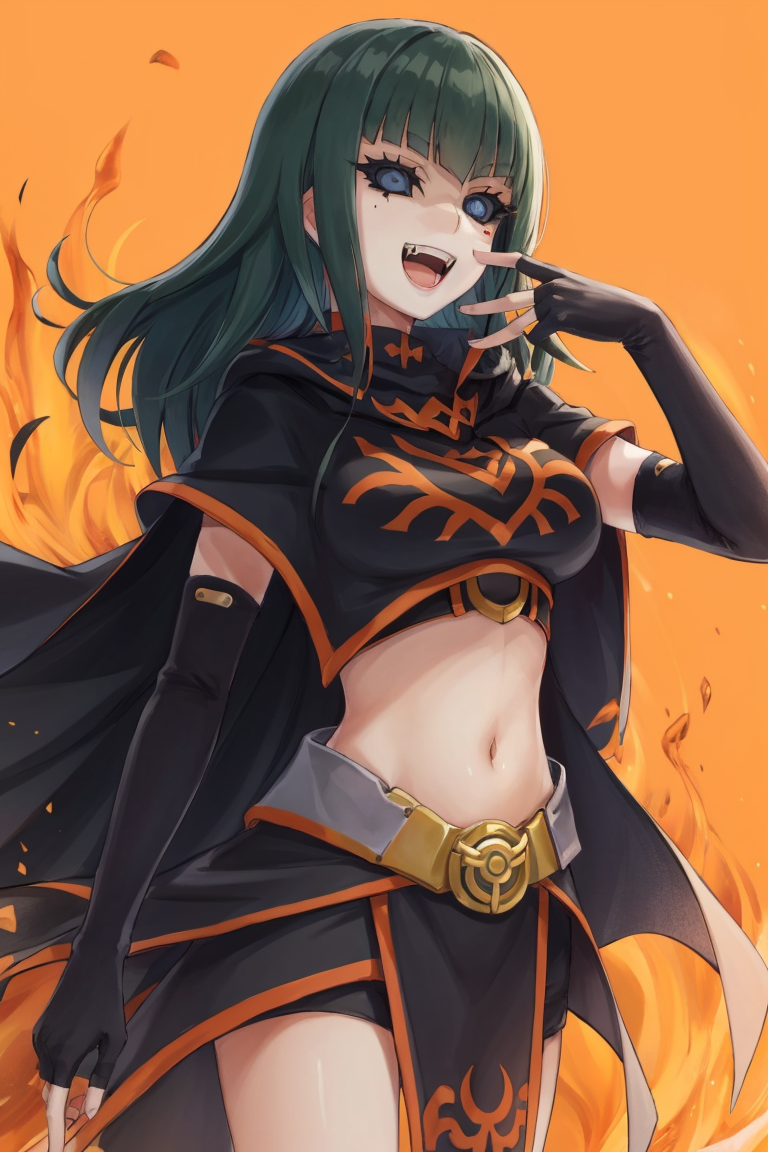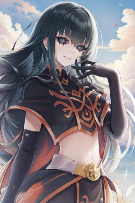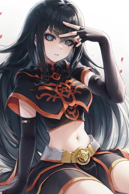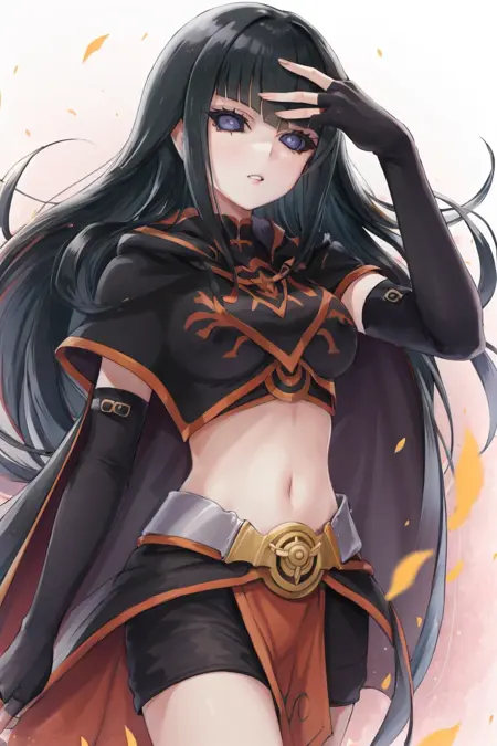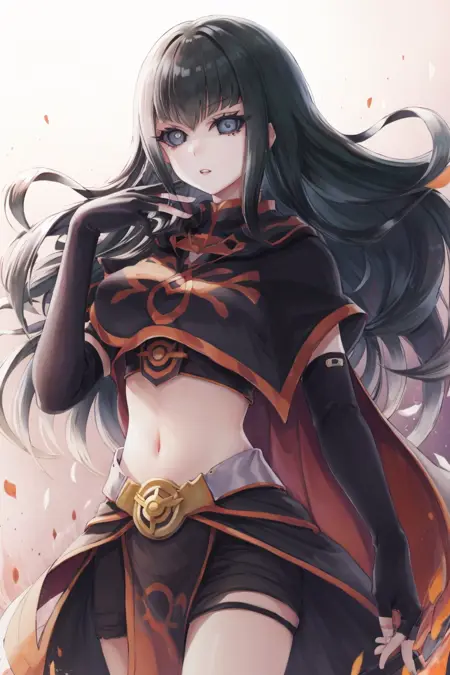Tags for her outfit: long hair, skirt, gloves, navel, black gloves, elbow gloves, midriff, fingerless gloves, black skirt, cape, crop top, capelet