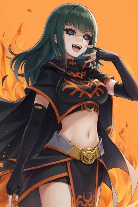 외모를 위한 태그: 긴 머리카락, 치마, 장갑, 배꼽, 검은 장갑, 팔꿈치 장갑, 중식부, 손가락 없음 장갑, 검은 치마, 망토, 크롭 톱, 캐플렛