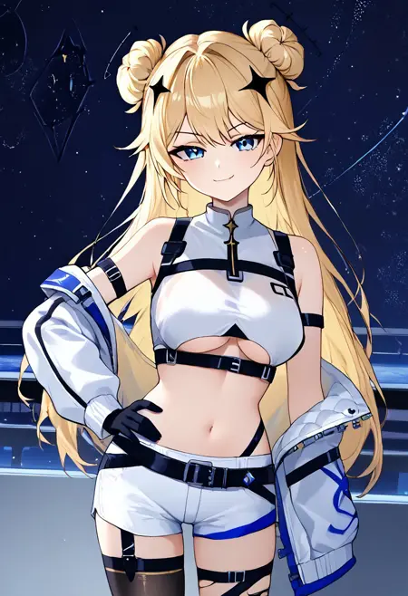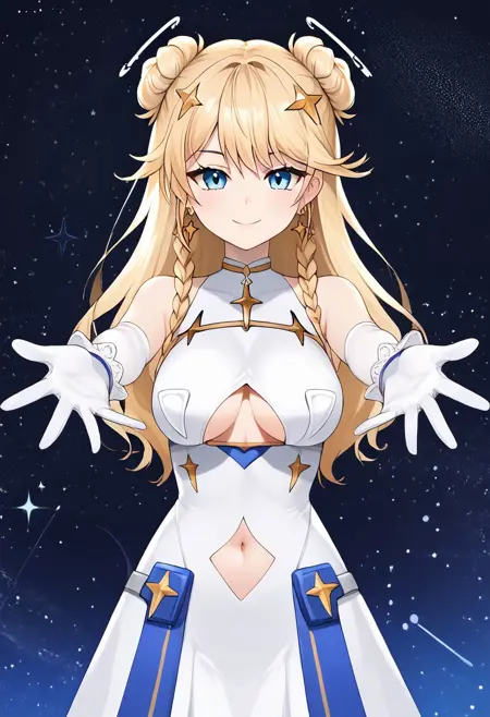 头部:Lumi1st,金发,长发,蓝眼,发髻,双发髻,刘海,珠宝,星星发饰,星星耳环,辫子,光晕,