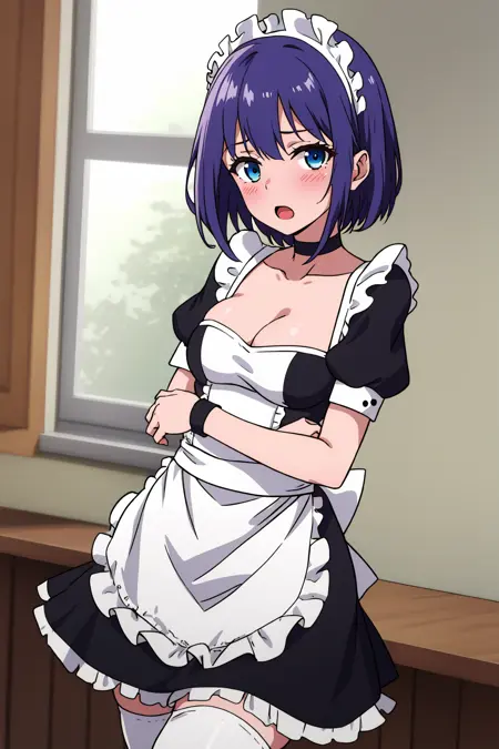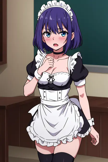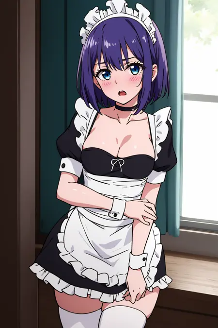 Prompt: hoshizuki kaede, 1girl, purple hair, solo, breasts, looking at viewer, blush, short hair, open mouth, blue eyes, thighhighs, dress, cleavage, medium breasts, short sleeves, frills, choker, puffy sleeves, black thighhighs, apron, puffy short sleeves, zettai ryouiki, wrist cuffs, maid, maid headdress, white apron, maid apron