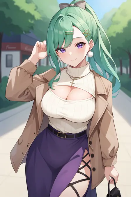 beniyakumo, 1girl, solo, green hair, long hair, ponytail, hair bow, grey bow, hairclip, hair ornament, swept bangs, purple eyes, large breasts, cleavage, mole, mole on breast, brown coat, white sweater, cleavage cutout, see-through, turtleneck sweater, black belt, purple skirt, long skirt, cross-laced clothes, side slit, handbag, earrings, pom pom \(clothes\)