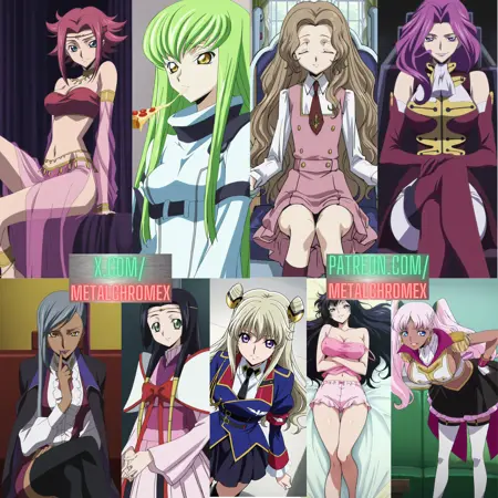 Code Geass characters: Kallen Stadtfeld/Kallen Kōzuki, C.C., Sakuya Sumeragi, Rakshata Chawla, Nunnally vi Britannia, Leila Malcal, Catherine Sabathra, Kaguya Sumeragi, Villetta Nu