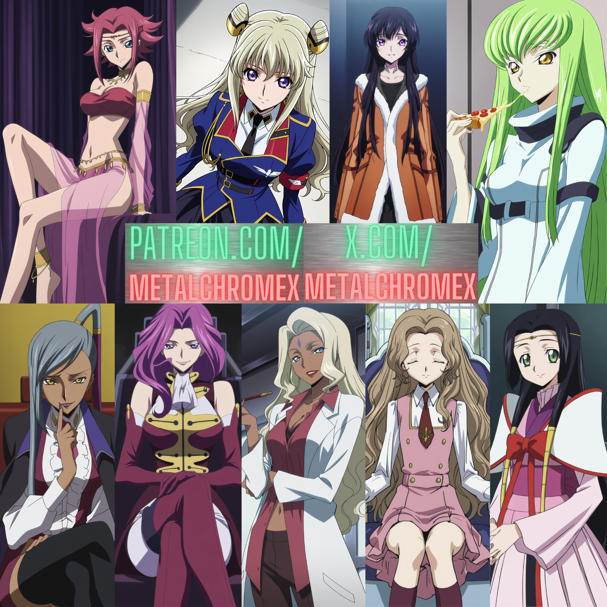 Code Geass characters: Kallen Stadtfeld/Kallen Kōzuki, C.C., Sakuya Sumeragi, Rakshata Chawla, Nunnally vi Britannia, Leila Malcal, Catherine Sabathra, Kaguya Sumeragi, Villetta Nu