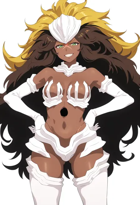 Ressureccion 衣装プロンプト:1girl, resurreccion, yellow hair, brown hair, long hair, green eyes, dark skin, scar on face, helmet, armor, armored thong, thigh boots, bare shoulders, navel, abs, elbow gloves