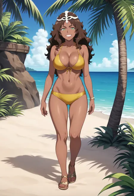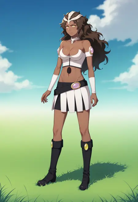 デフォルトの衣装プロンプト:1girl, franceskamila, brown hair, long hair, green eyes, dark skin, cleavage, corset, midriff, navel, skirt, bracers, black boots, belt