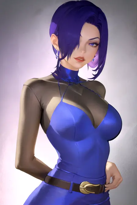 BridgetteBleu, 1girl, solo, large breasts, blue dress, jewelry, purple hair, earrings, belt, hair over one eye, lips, halterneck