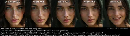By using this clever trick, Lora will basically tell Flux to generate anything except a typical Flux face. And as result, we'll get beautiful unique faces every time!