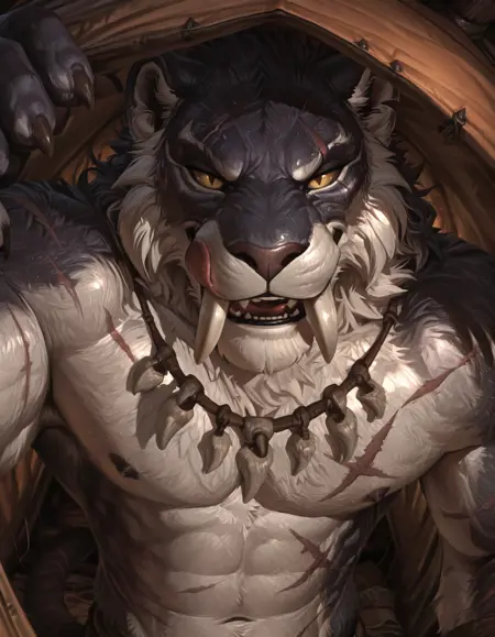 Tags: saberon, anthro, cat, fur, hair, fangs, digitigrade, muscular, sabertooth, tail, claws, colored sclera, yellow eyes, slit pupils, etc... Optional: Tiger, snow leopard, panther, stripes, leopard pattern