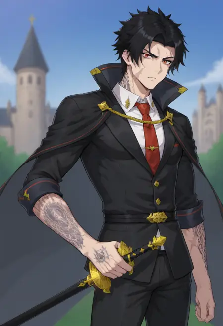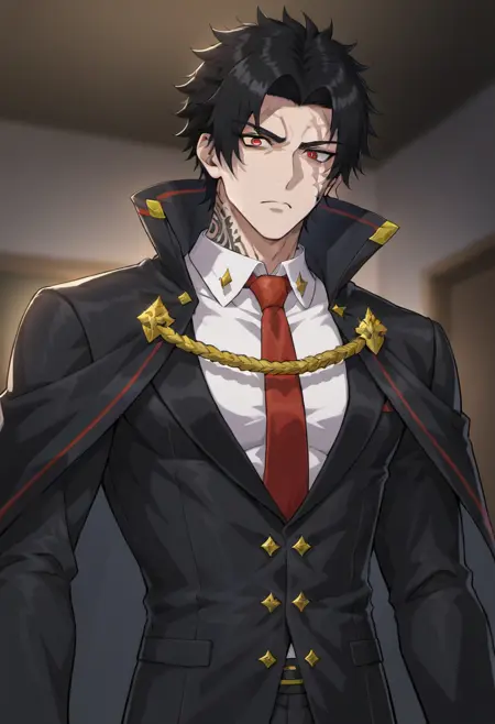 RViolet, black hair, middle parted hair, red eyes, tattoos, scars,