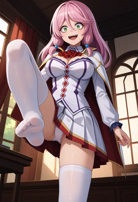 Default Outfit: white cape, white dress, red ascot, long sleeves, white skirt, pleated skirt, white thighhighs, cleavage