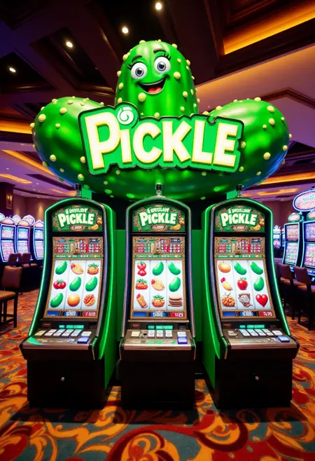 这是一张高质量照片,展现了赌场中一台色彩鲜艳、充满奇趣的老虎机展示。