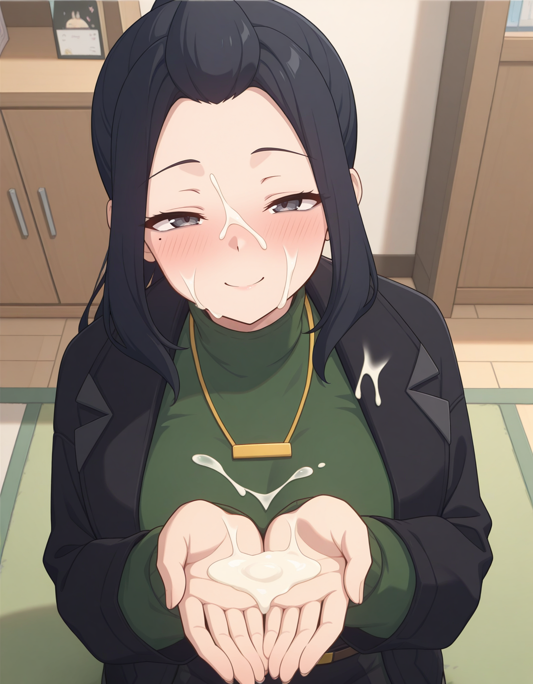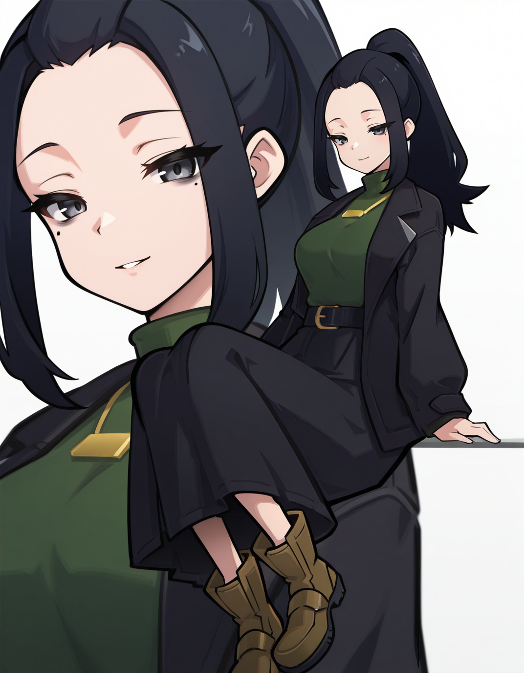 검정 코트, 긴 소매, 녹색 스웨터, 터틀넥 스웨터, 목걸이, 벨트, 검정 치마, 긴 치마, 발목 부츠, 갈색 신발,