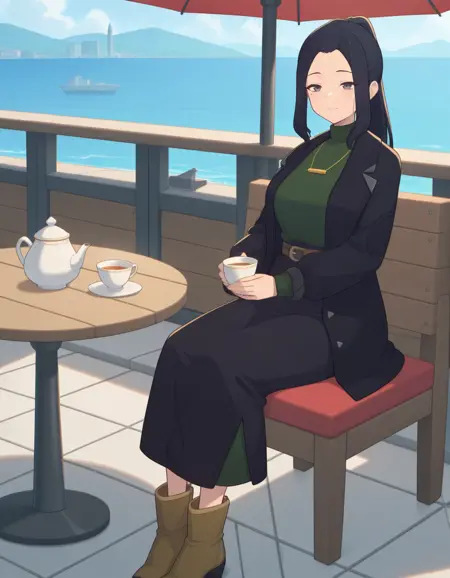 黒いコート、長袖、緑のセーター、タートルネックセーター、ネックレス、ベルト、黒いスカート、ロングスカート、アンクルブーツ、茶色の靴、